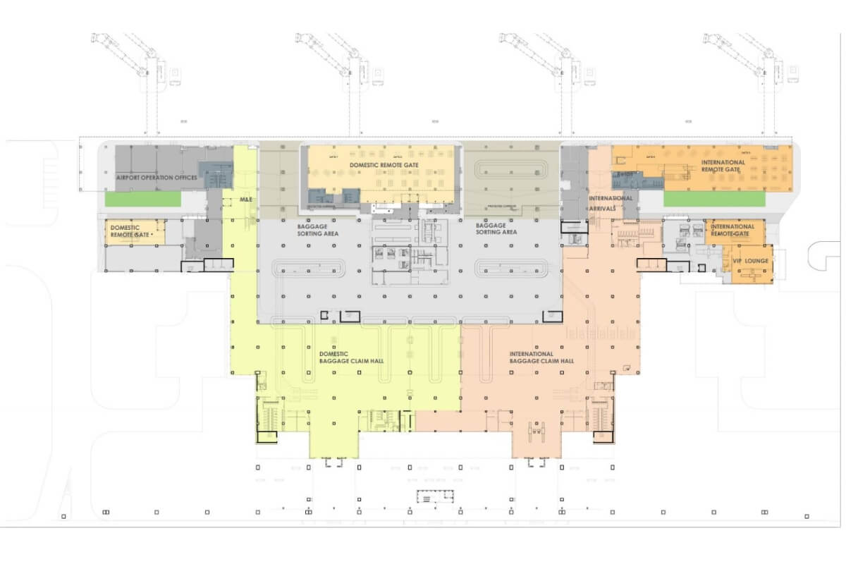 - International arrivals pass through immigration control, baggage claim, and customs inspection before exiting to the public arrivals hall.